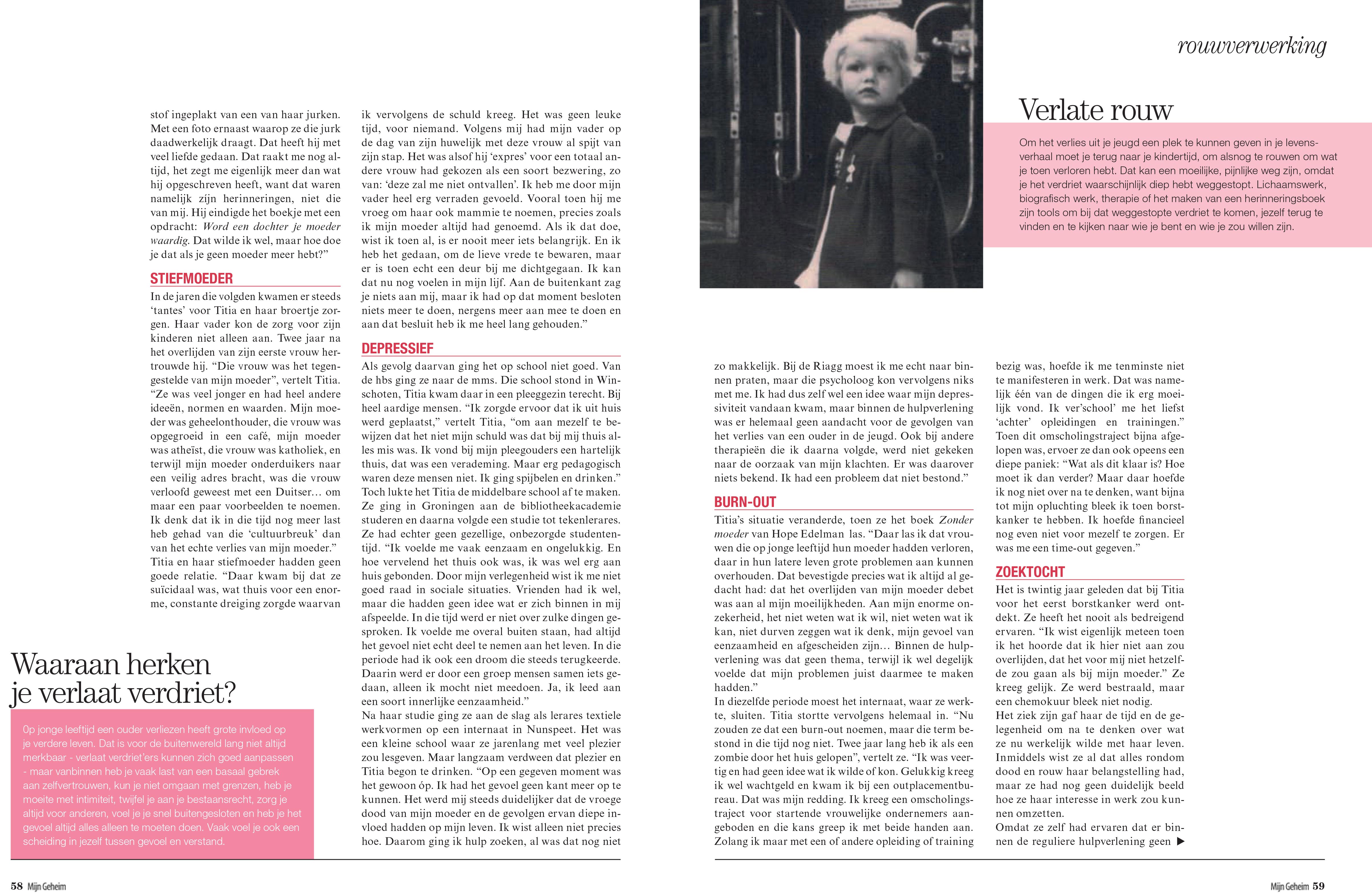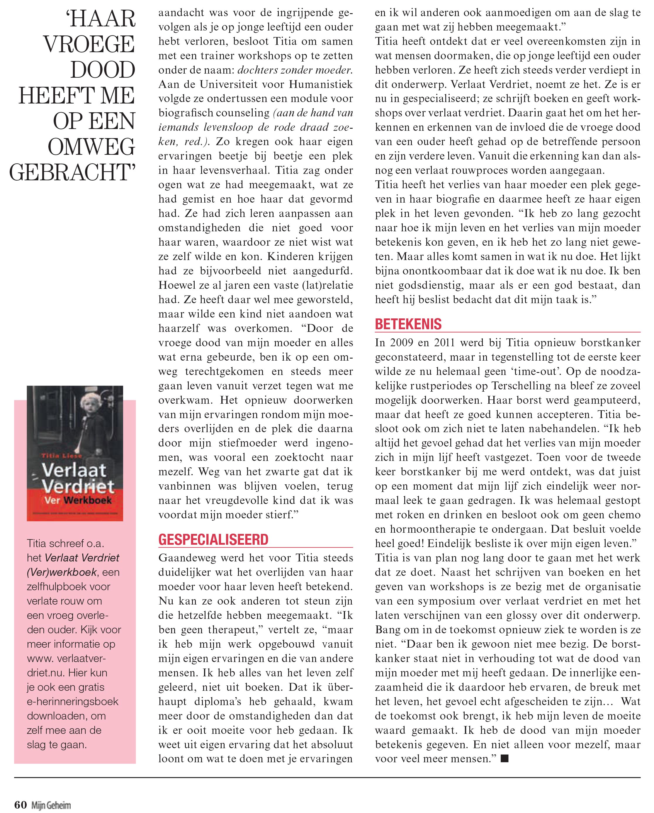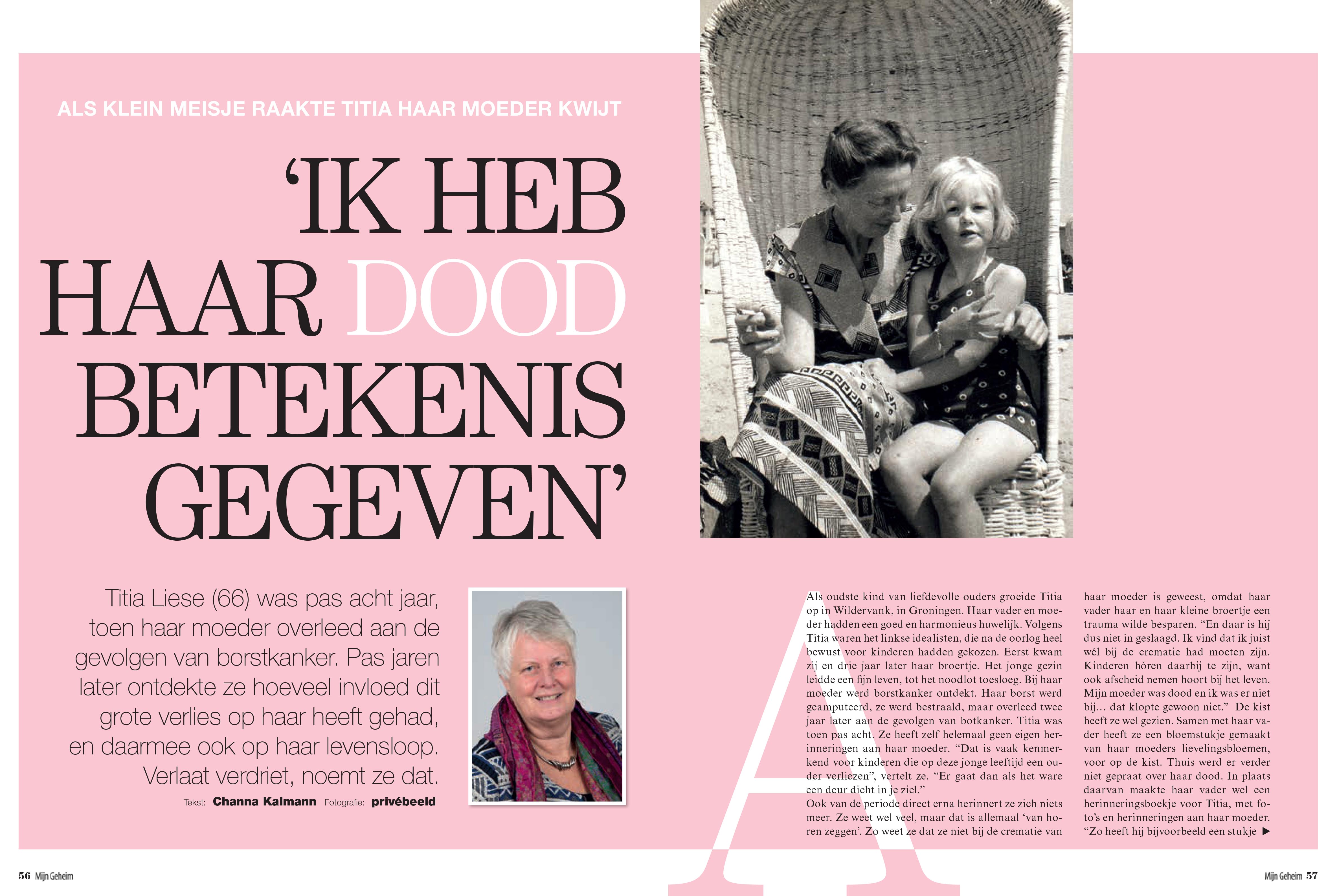 Channah Kalmann interviewt Titia Liese voor Mijn Geheim Titia Liese (1949) is acht jaar als haar moeder overlijdt aan de gevolgen van borstkanker. Pas vele jaren later komt ze erachter hoeveel invloed het verlies van haar moeder op haar persoon en haar verdere leven heeft gehad. Verlaat verdriet, noemt ze dat. Nu helpt ze anderen…